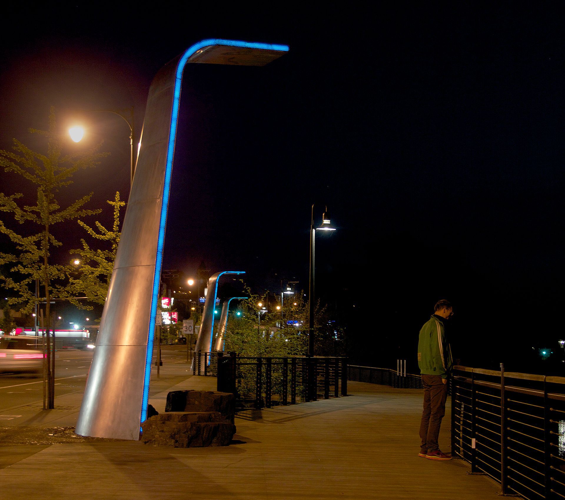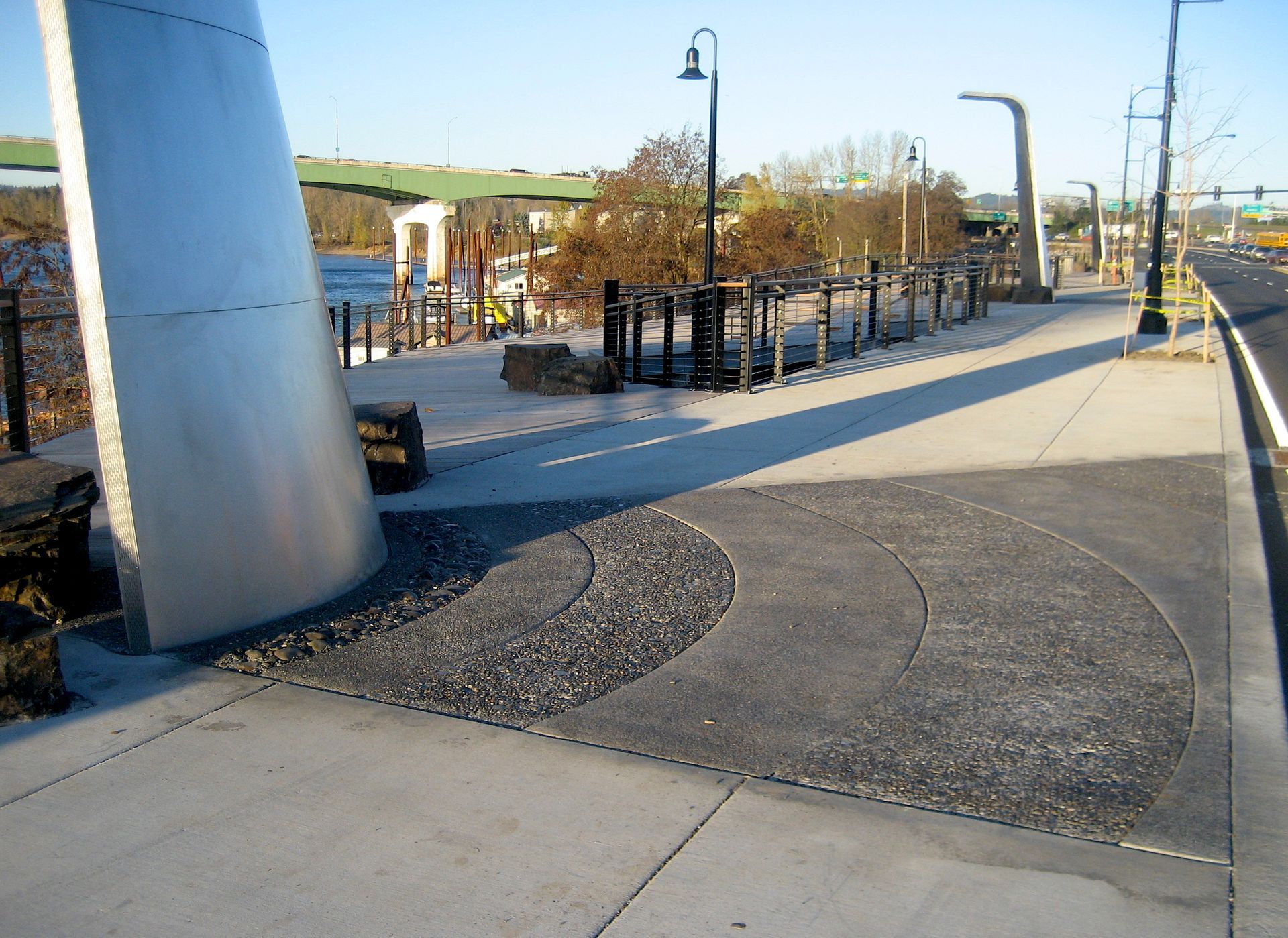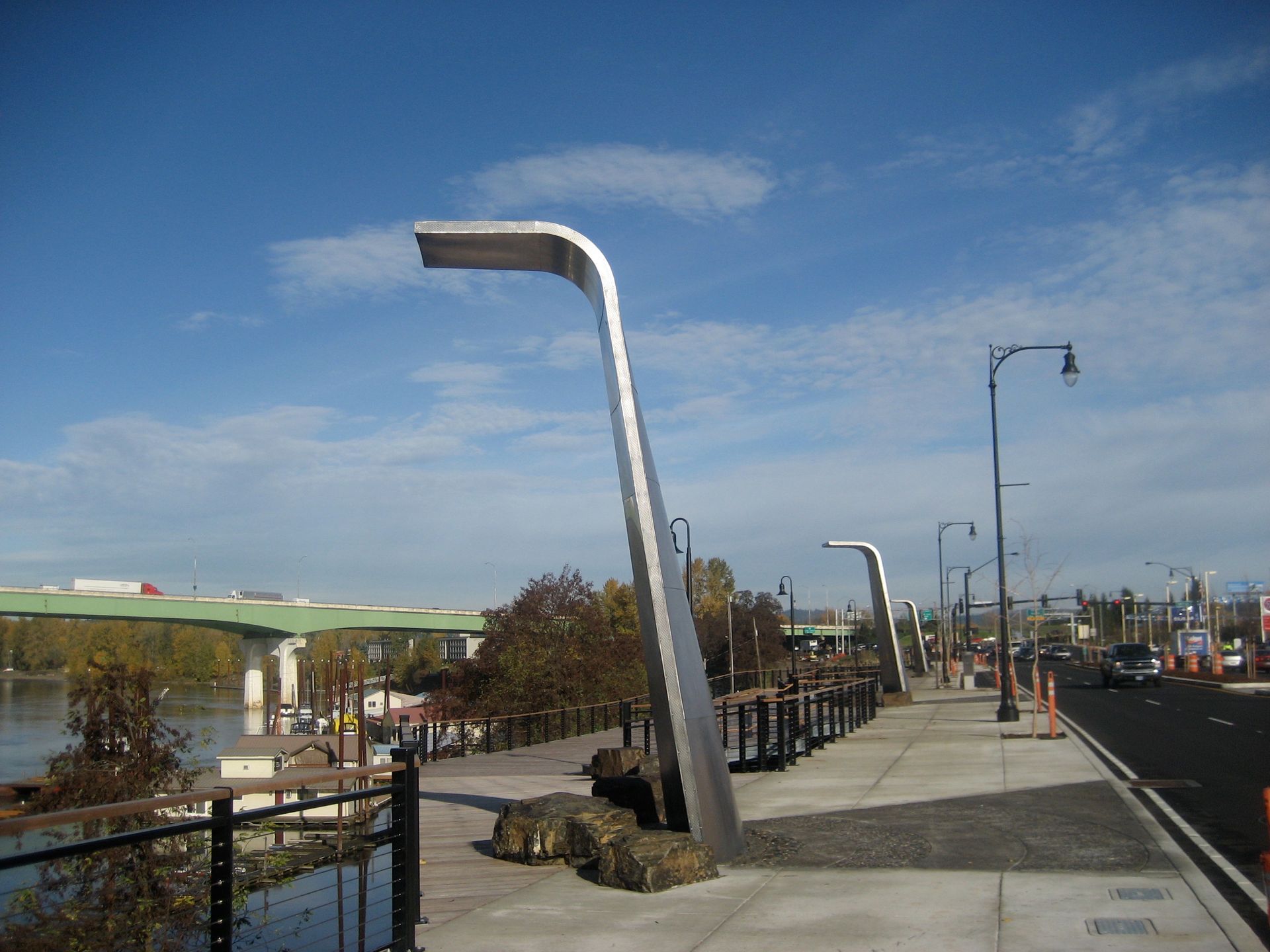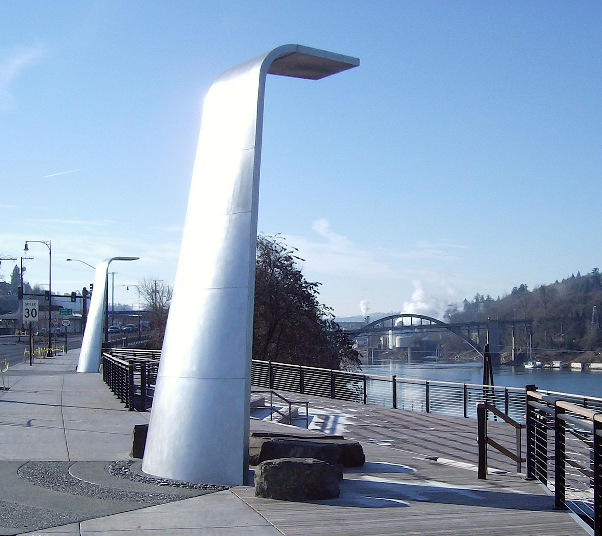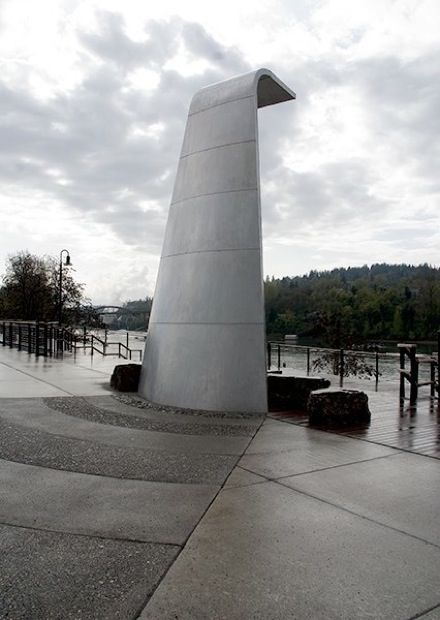 Hwy 99E/McLoughlin Blvd Enhancement Public Art project, Oregon City, OR. In collaboration with Adam Kuby. 3 monumental waterfall sculptures on a hardwood promenade deck overlook the river and nearby Willamette Falls.
