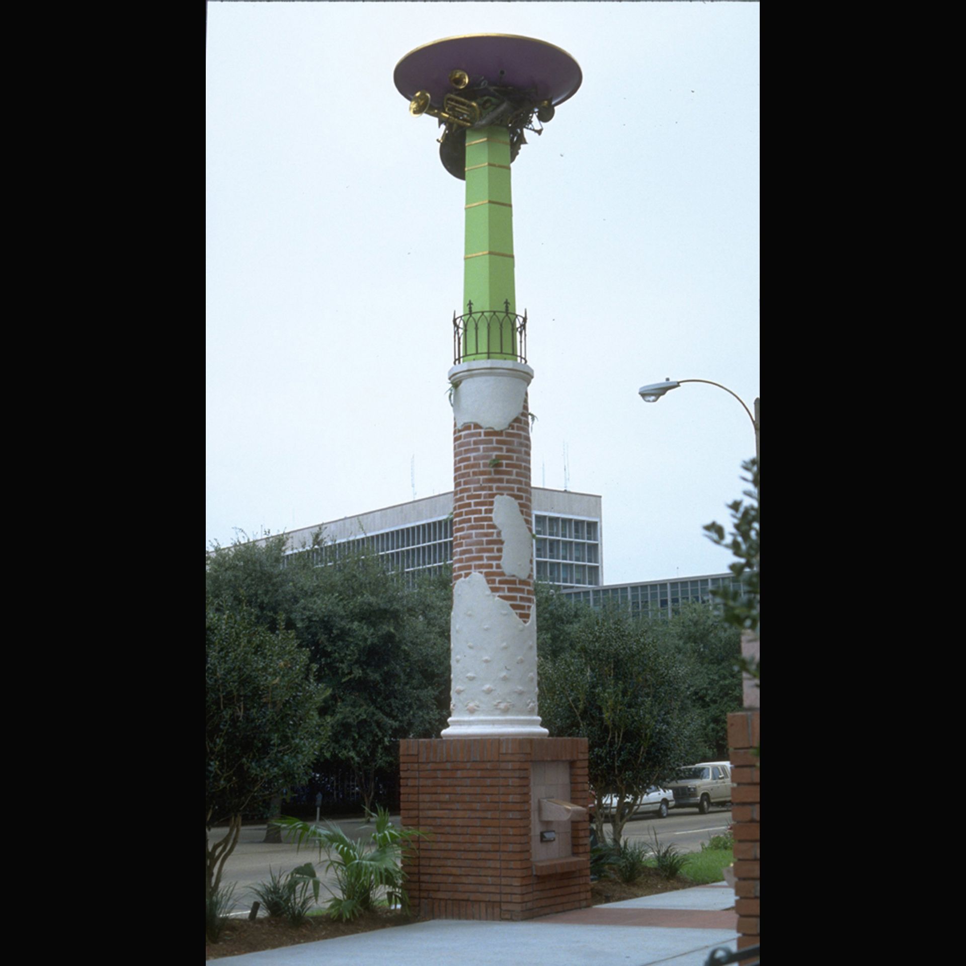 26 foot column representing the city of New Orleans, feature of the Bloch Cancer Survivors' Plaza, N.O.LA, masonry and metal, with brass musical