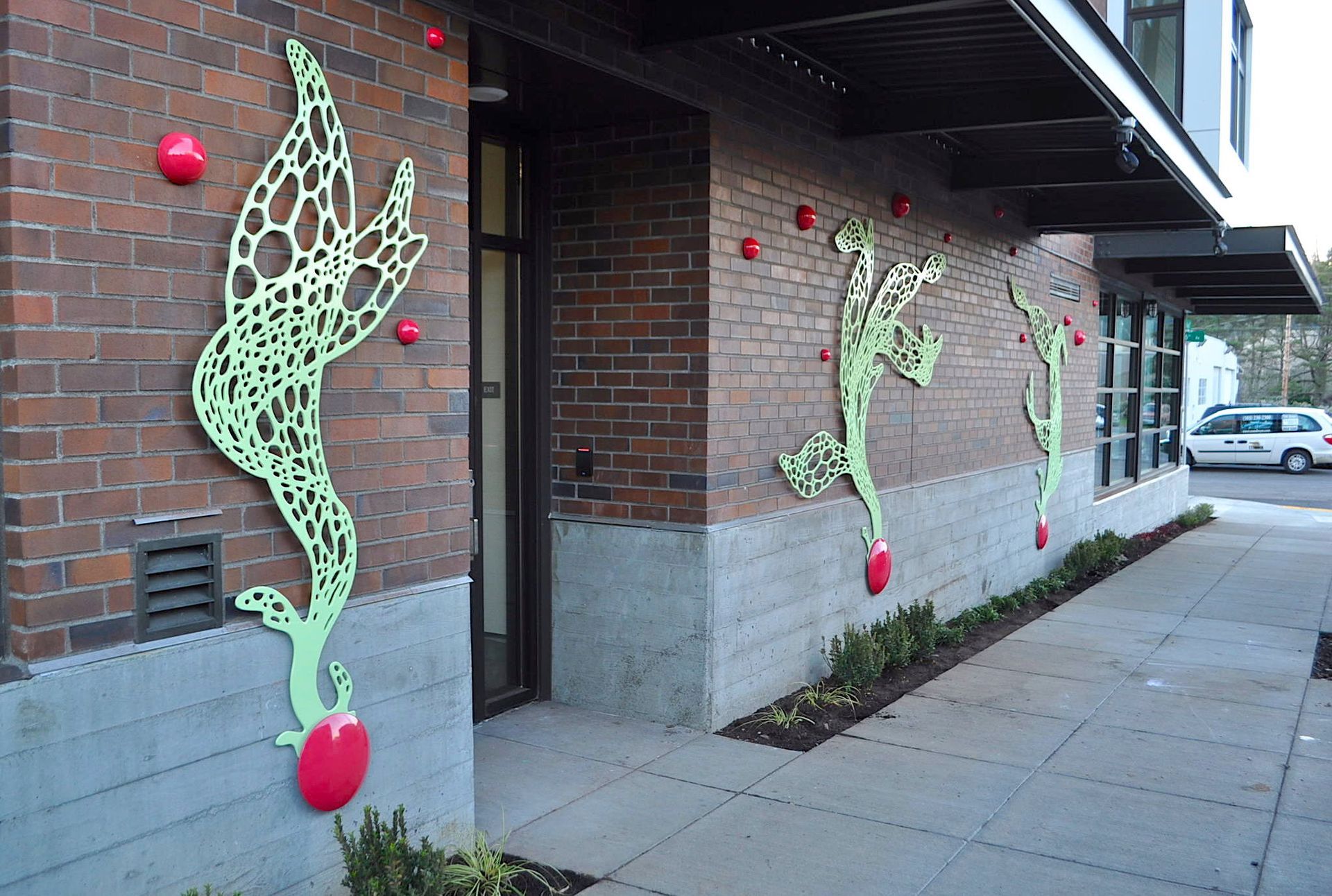Inspired by the forms and structures of plant and fungi growing native to the Pacific Northwest, the forms suggest a symbiotic porous lichen sited on its “host building, and the spherical shapes suggest nutrients gathered from floating air currents and airborne seeds propagating new life.