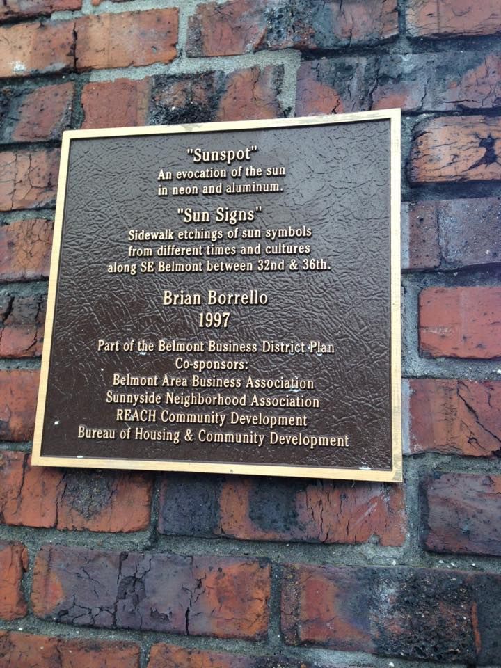Evocation of the sun for Sunnyside neighborhood featuring "Sunsigns," dozens of sandblast-etched symbols of the sun from different times and cultures into sidewalk near "Sunspot," appear as "street fossils," S.E. Belmont/S.E. 35th St., Portland, OR. Client: Belmont Area Business Association