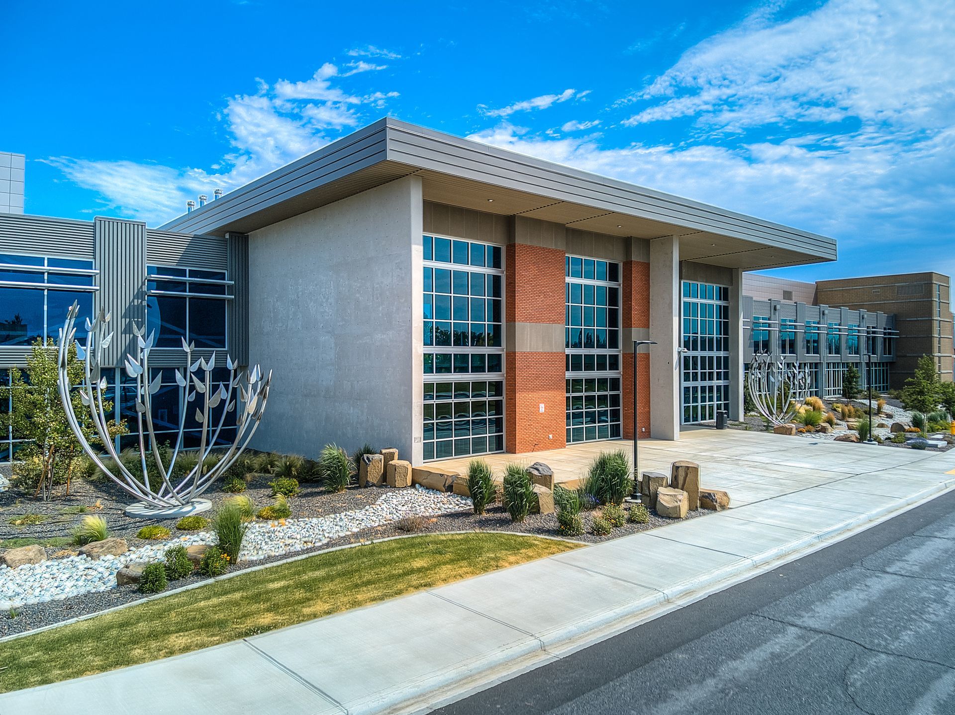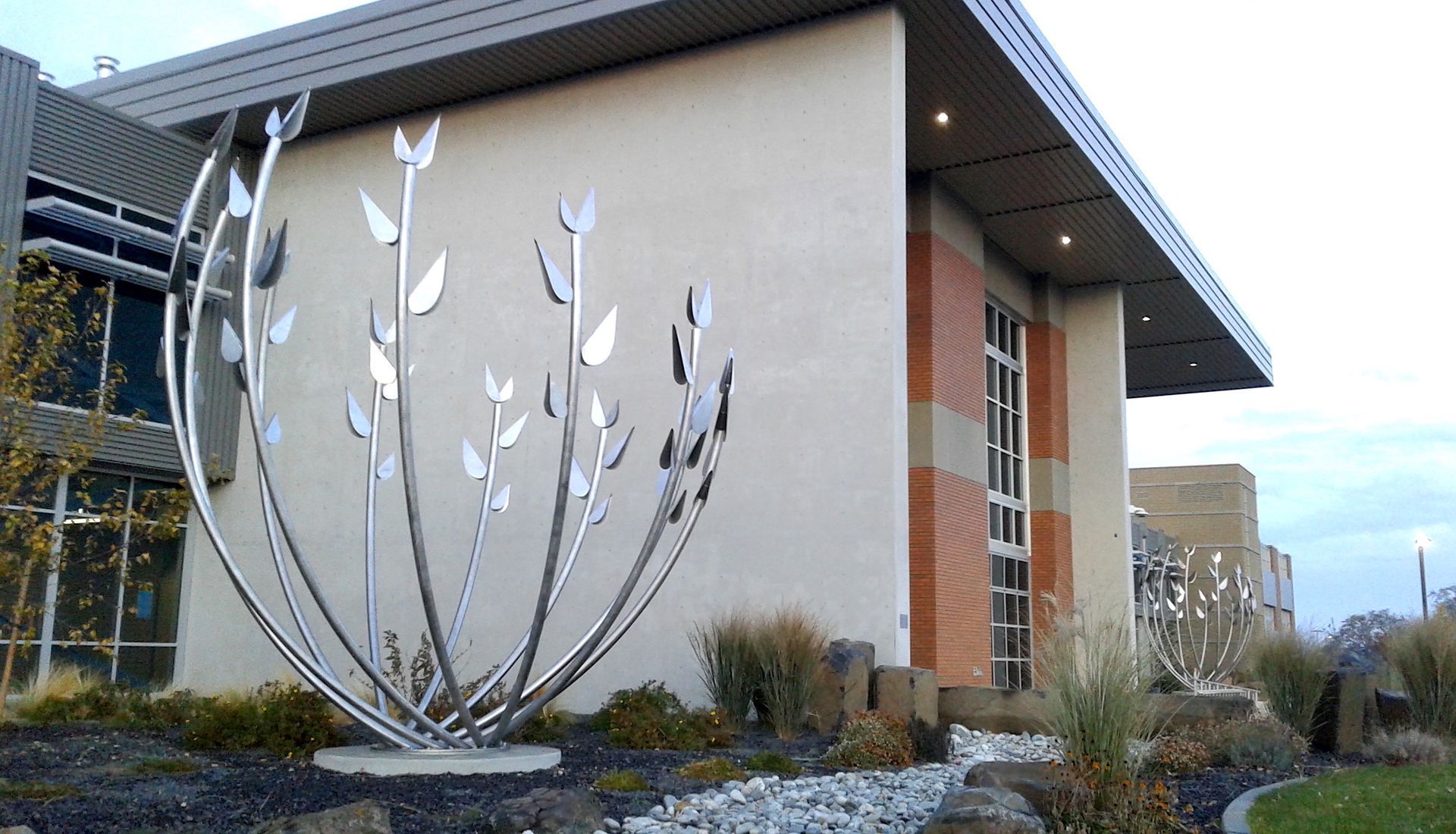 A pair of branching metal sculptures flank entry doors & social space at the new BBCC Professional/Technical Education Center (PTEC). Inspired by the growth patterns & shapes of plant life growing and recognizable in this high desert environment.